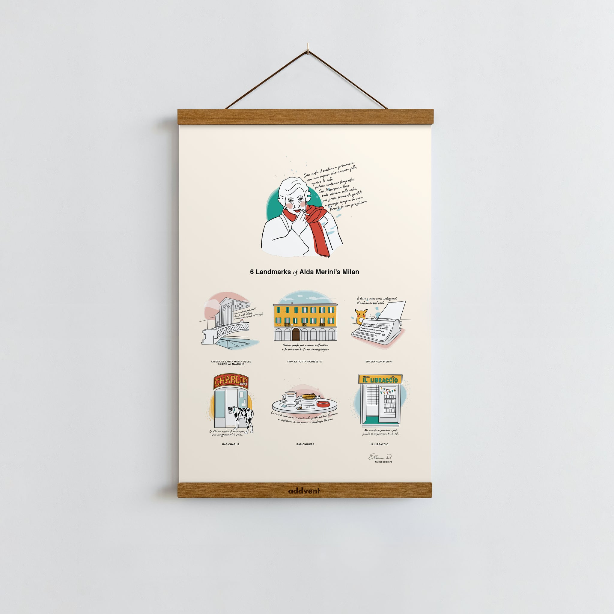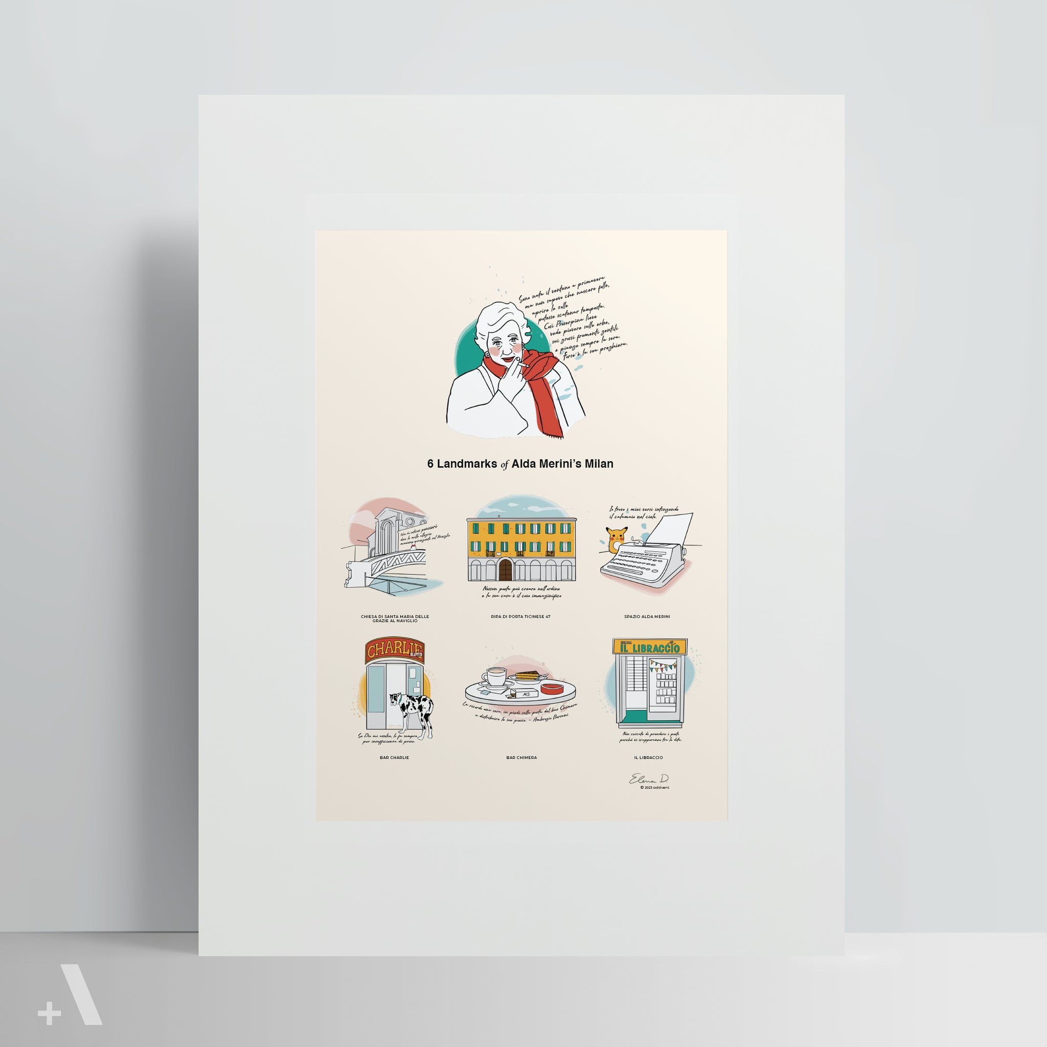 This Poster features 6 Landmarks of Alda Merini's Milan: