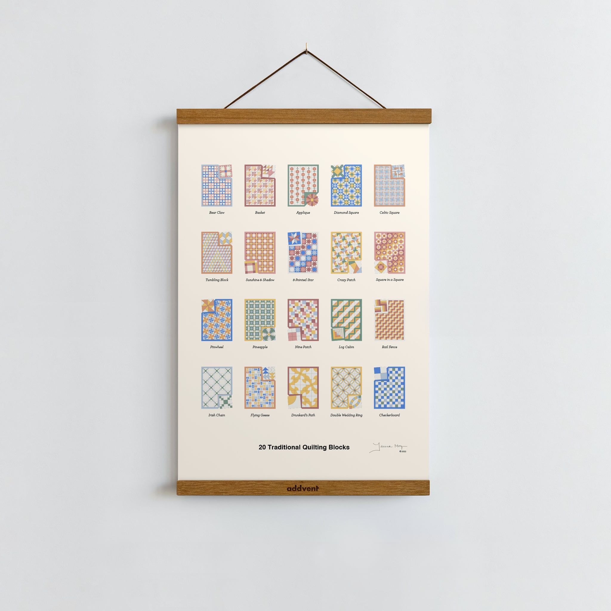 - Illustrated Design – Showcasing 20 classic quilt patterns, from Bear Claw to Log Cabin