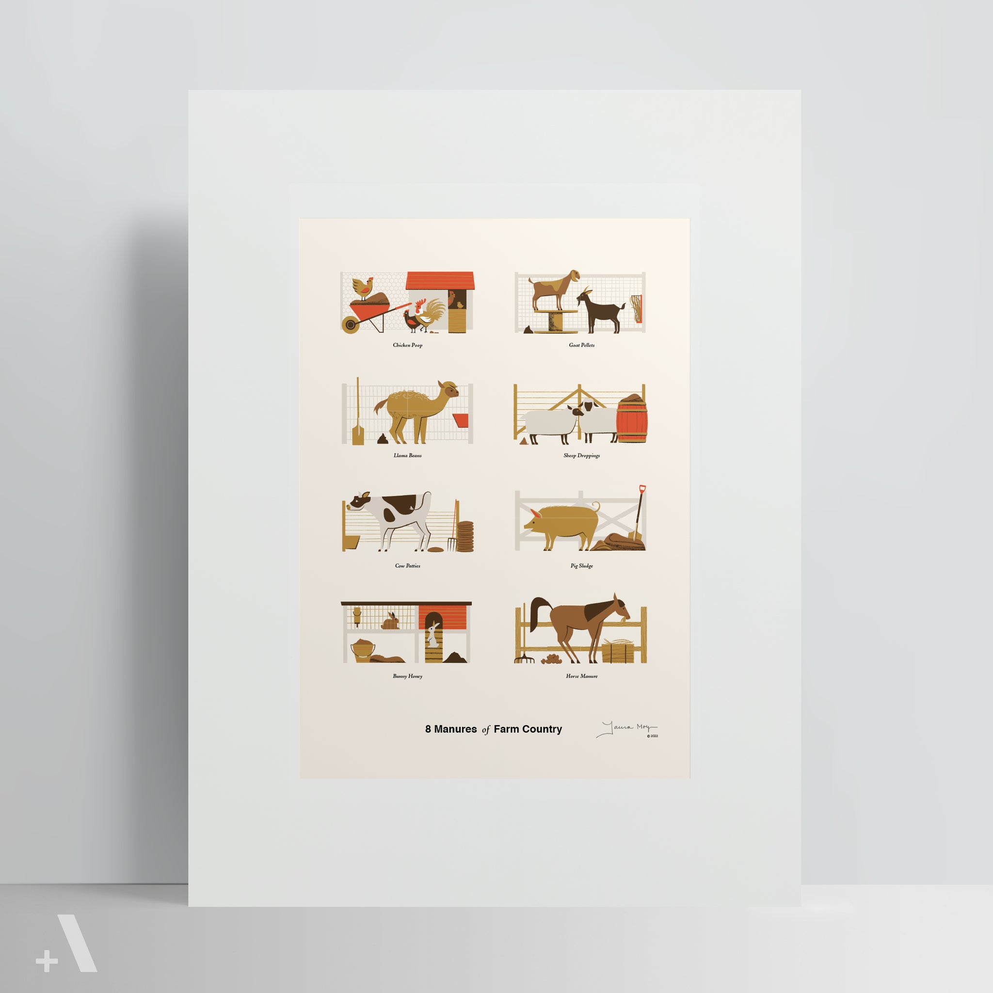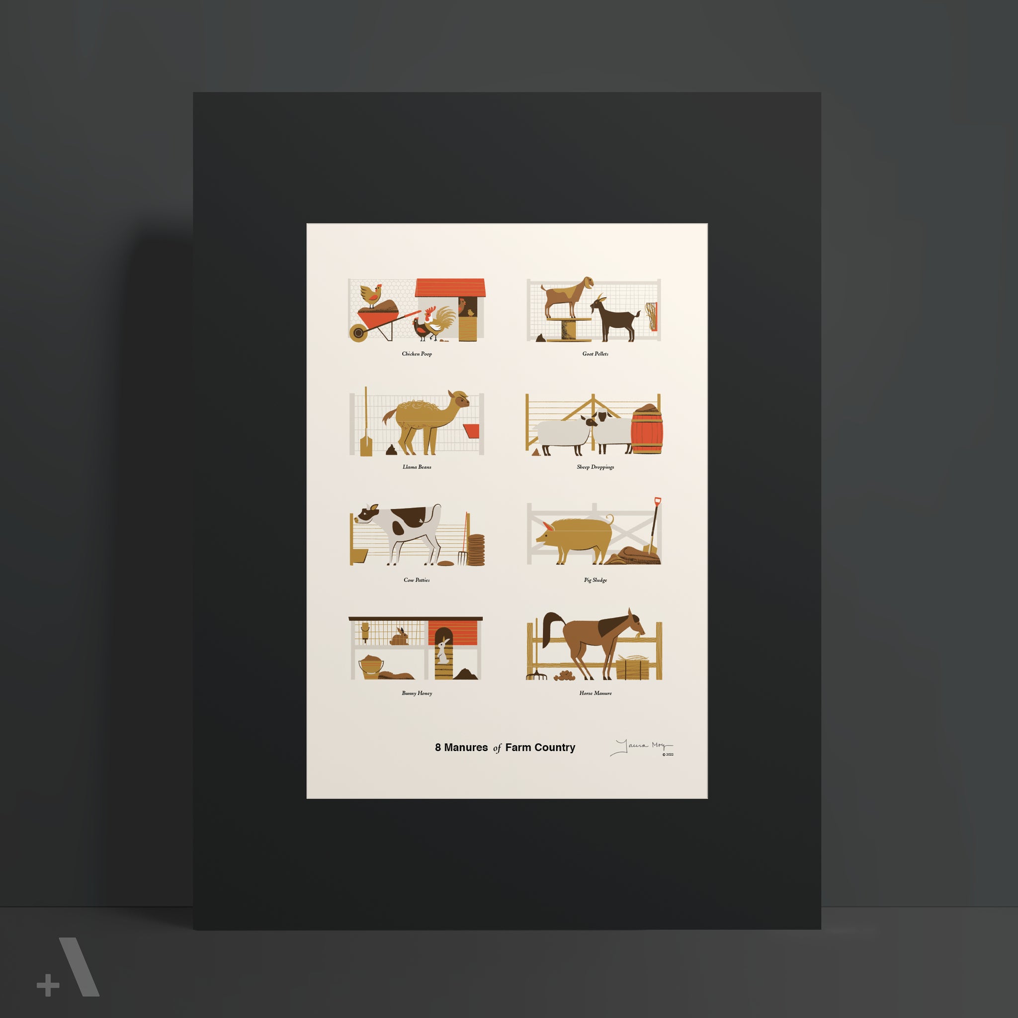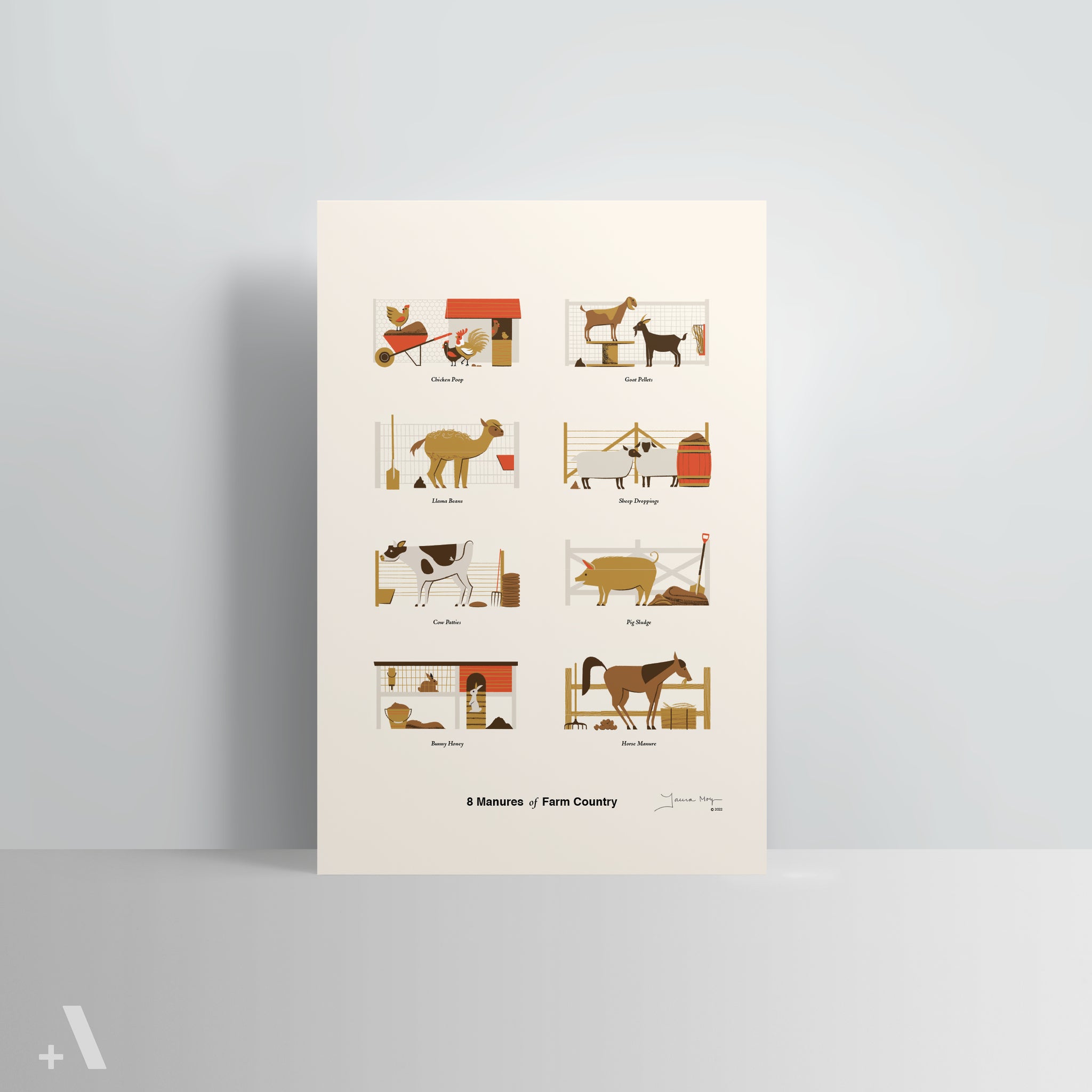 Celebrate the humorous side of farm life with our Animal Manures Poster. This 12x18” (Arch B) digital art print features the various types of animal manures commonly found on farms, including cow patties, pig sludge, and chicken poop. Each manure type is beautifully illustrated with vibrant detail, showcasing the natural humor of farm aromas and their role in agriculture.