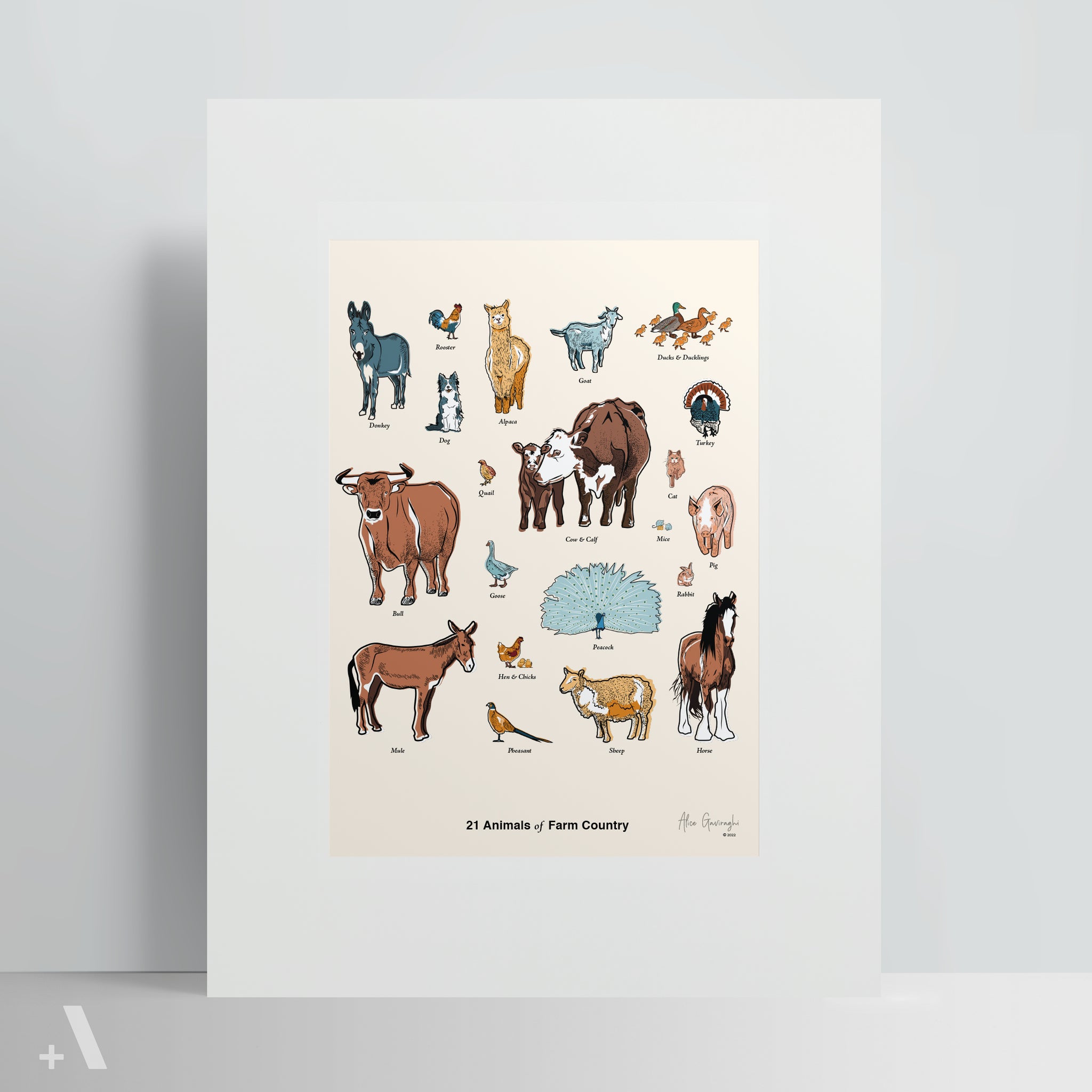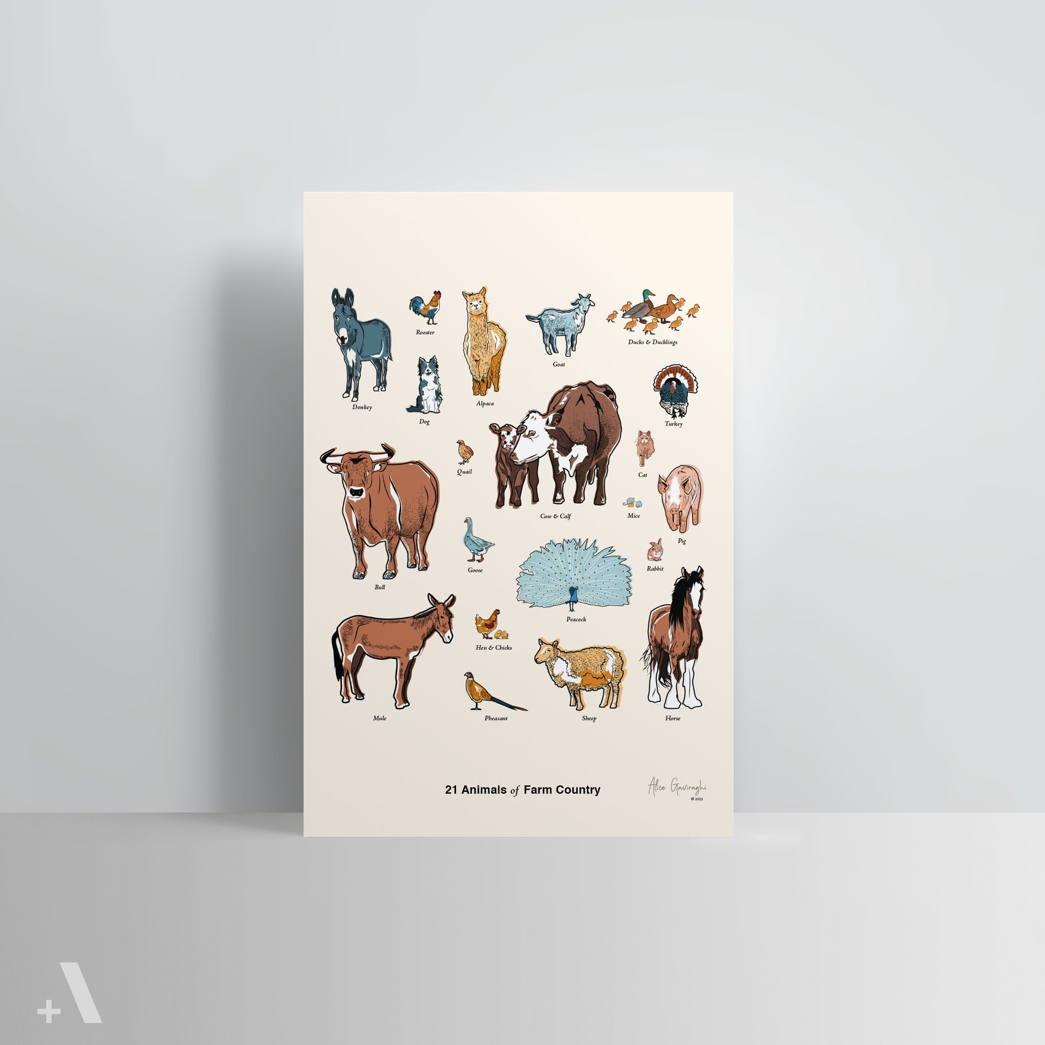 Celebrate the heart of farm life with our Animals of Farm Country Poster. This hand-illustrated 12x18” (Arch B) print showcases iconic farm animals like cows, chickens, horses, and sheep, each depicted with vibrant colors and intricate detail.