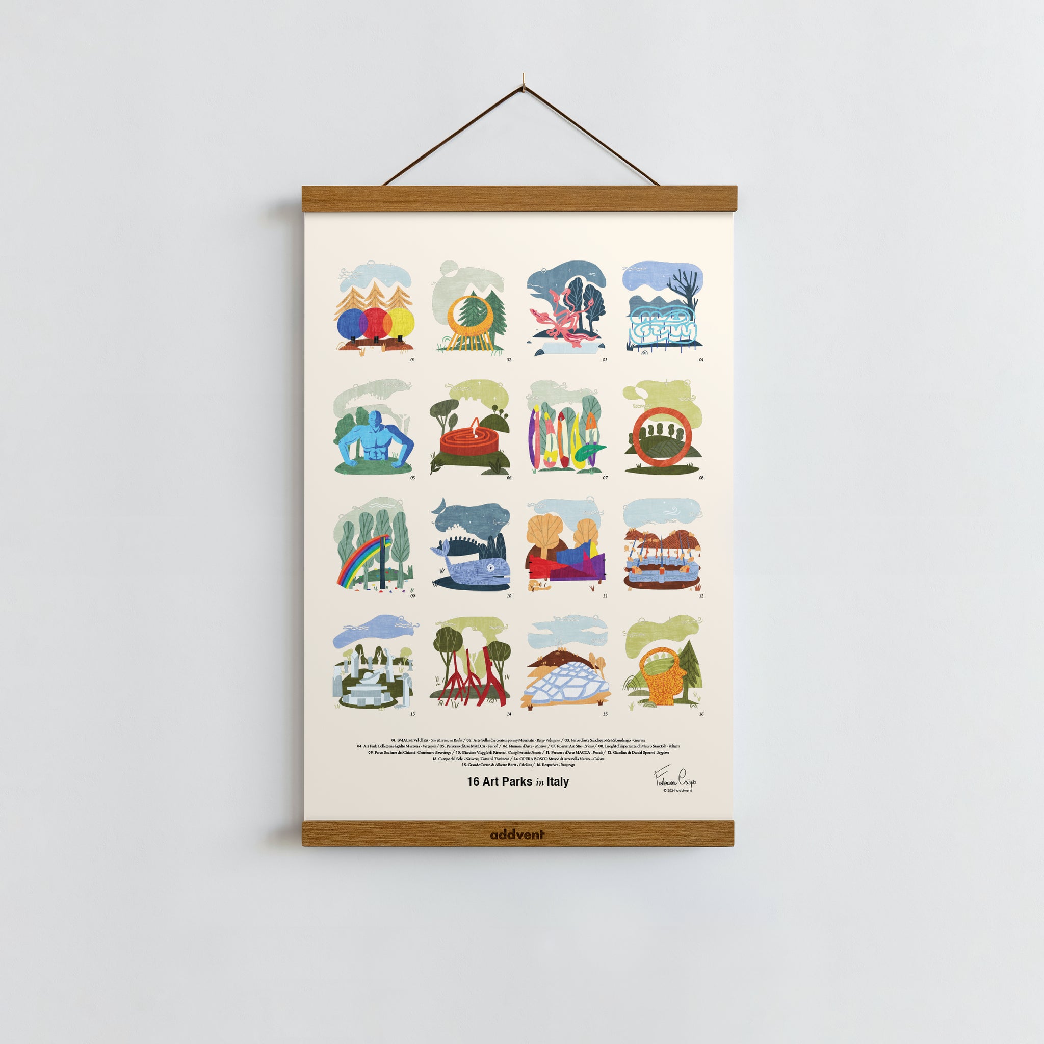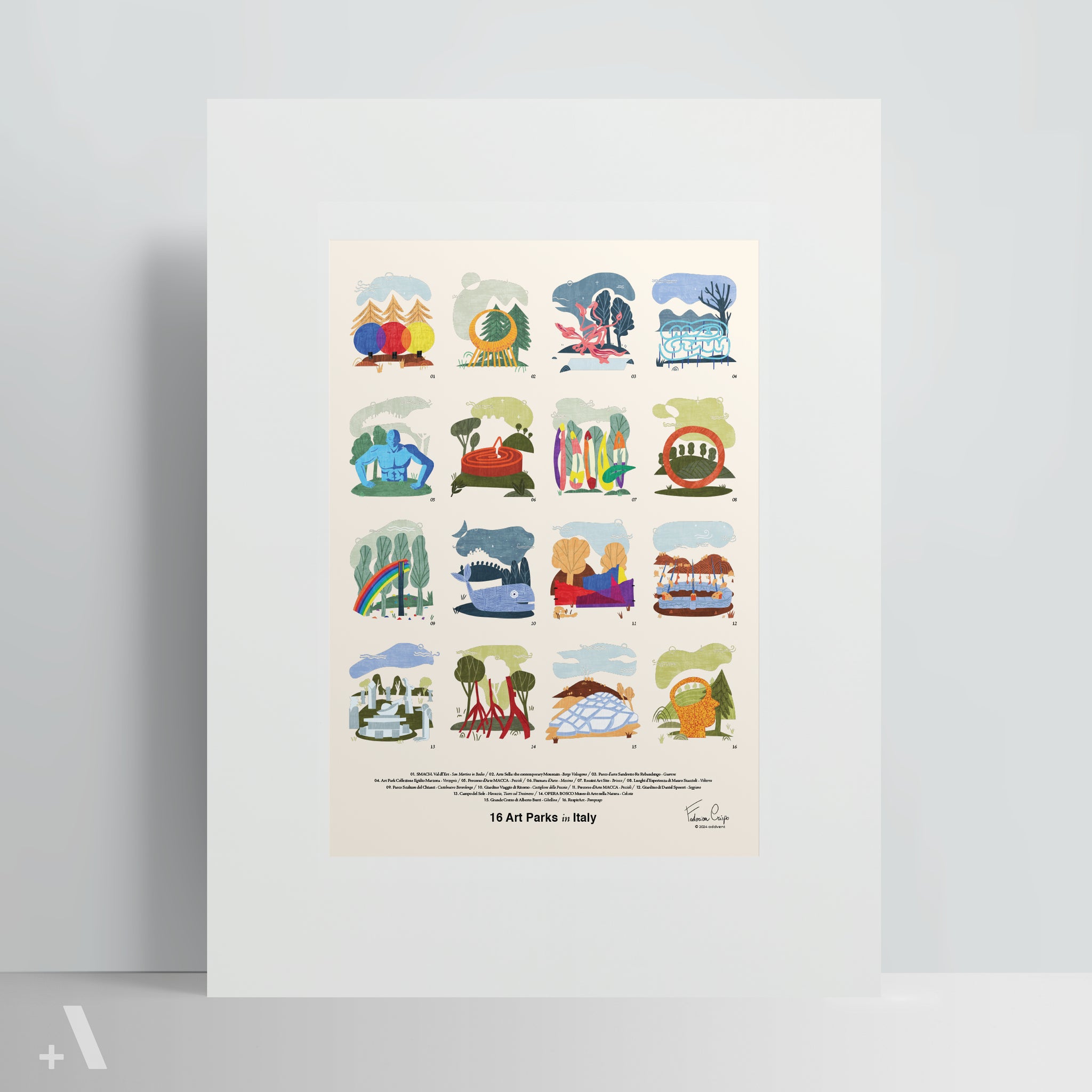 This Poster features 16 Art Parks in Italy: