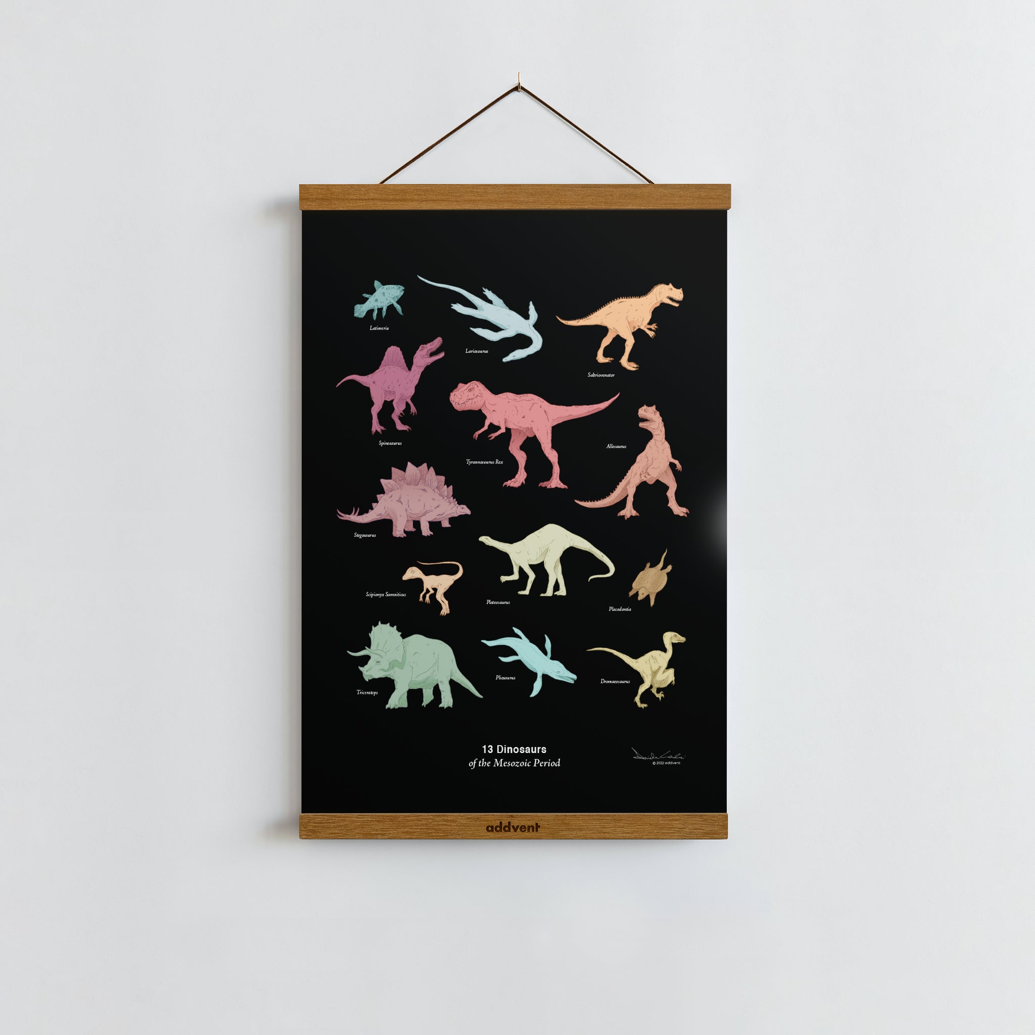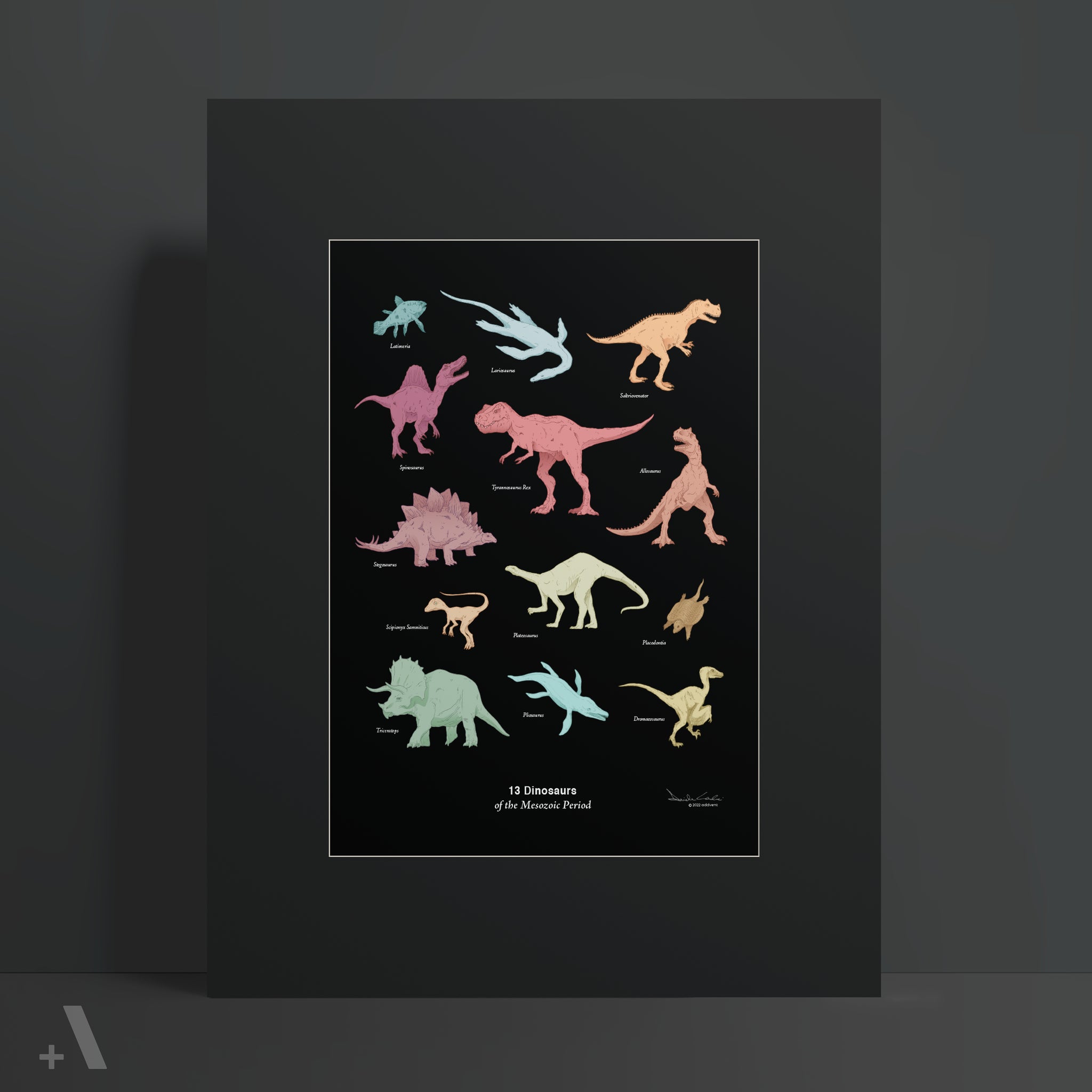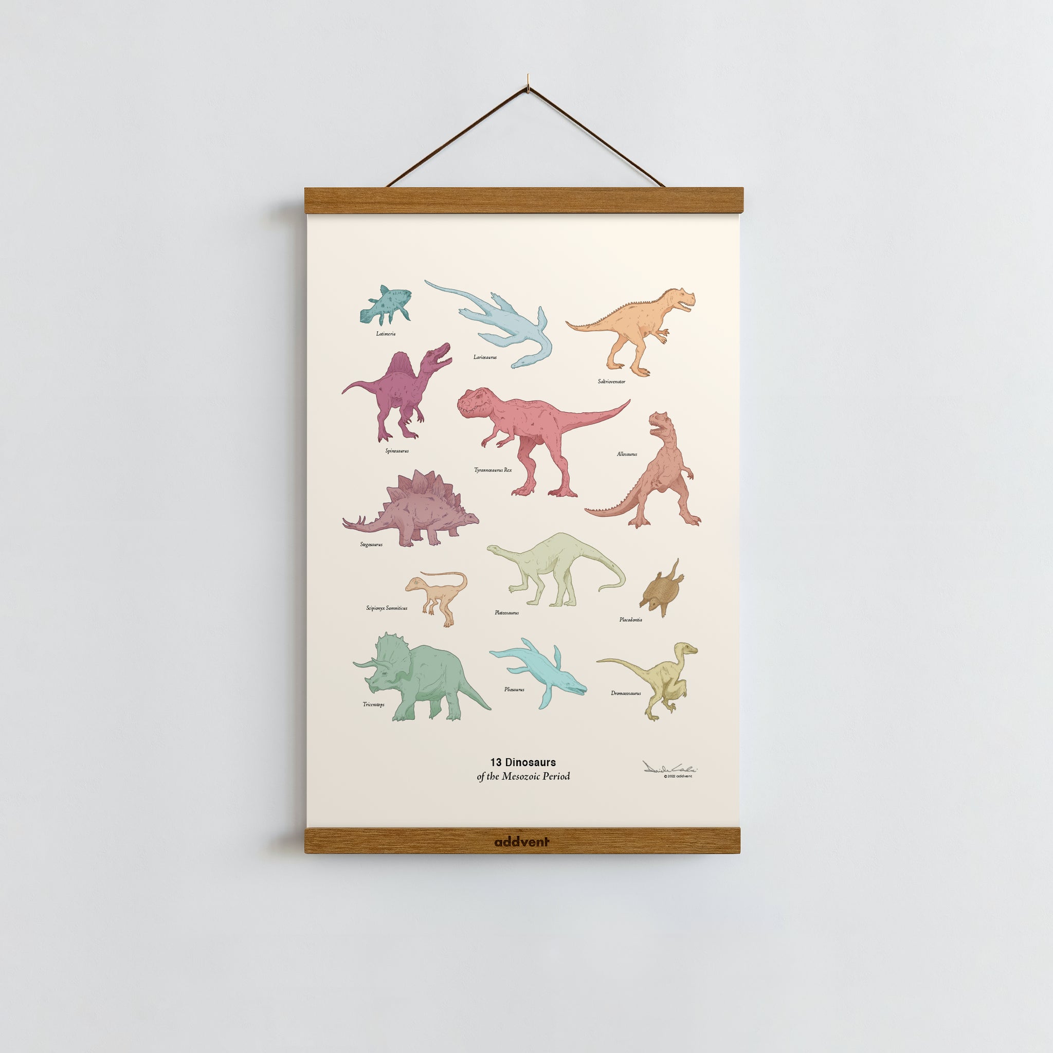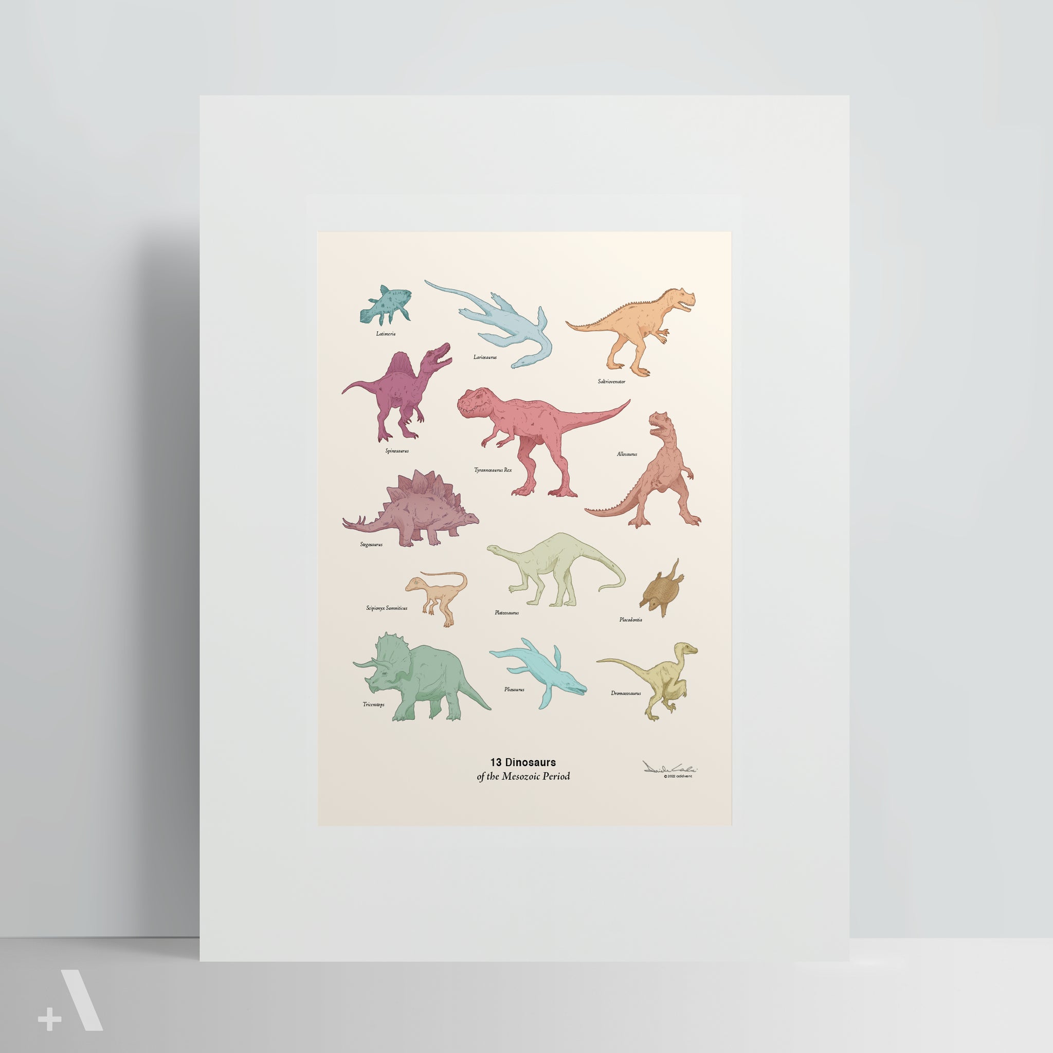This Poster features 13 Dinosaurs of the Mesozoic Period: