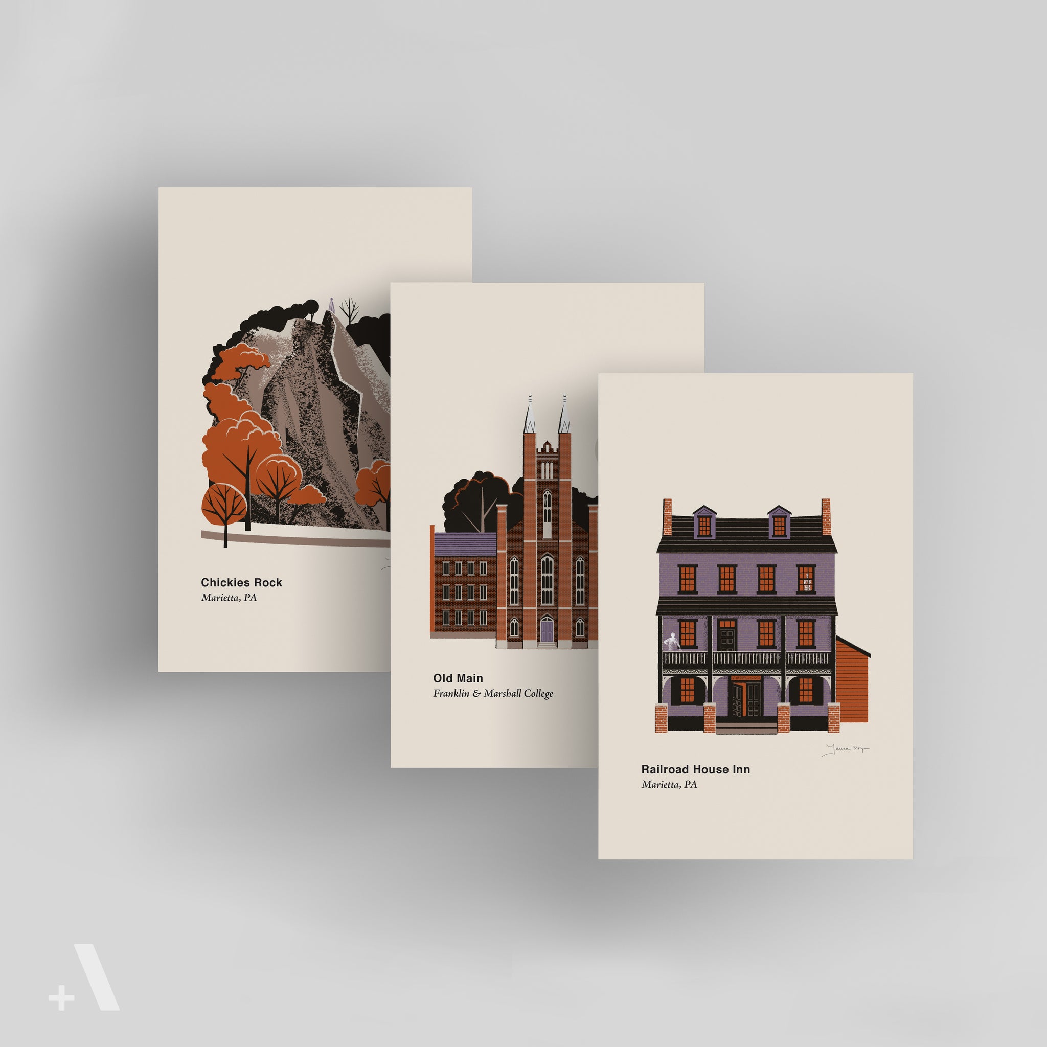 Step into the mysterious world of Lancaster County’s haunted history with our Haunted Places Small Prints. Each hand-illustrated 5.5x8.5” print (matted to 8x10”) features iconic haunted locations like Sickman’s Mill, Fulton Theatre, and Chickies Rock—places that are known for their ghostly legends and eerie charm.