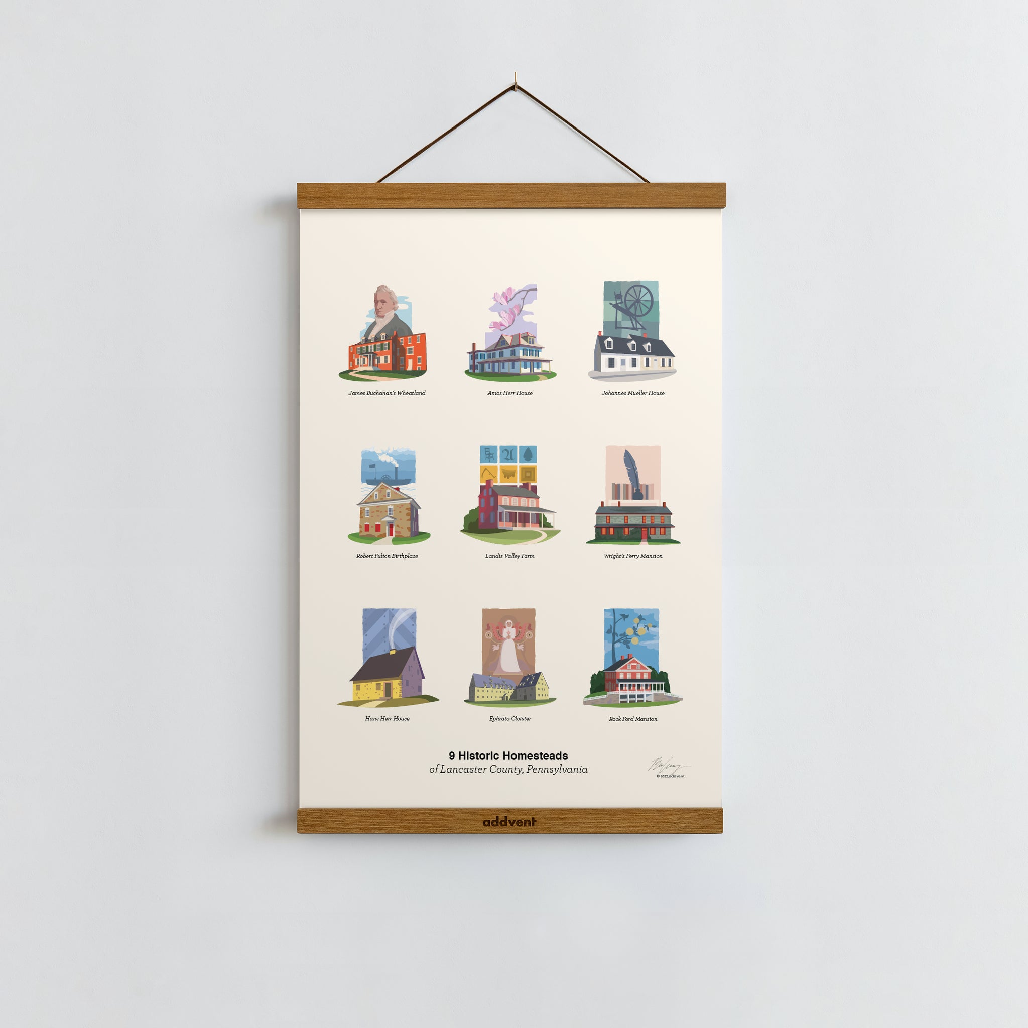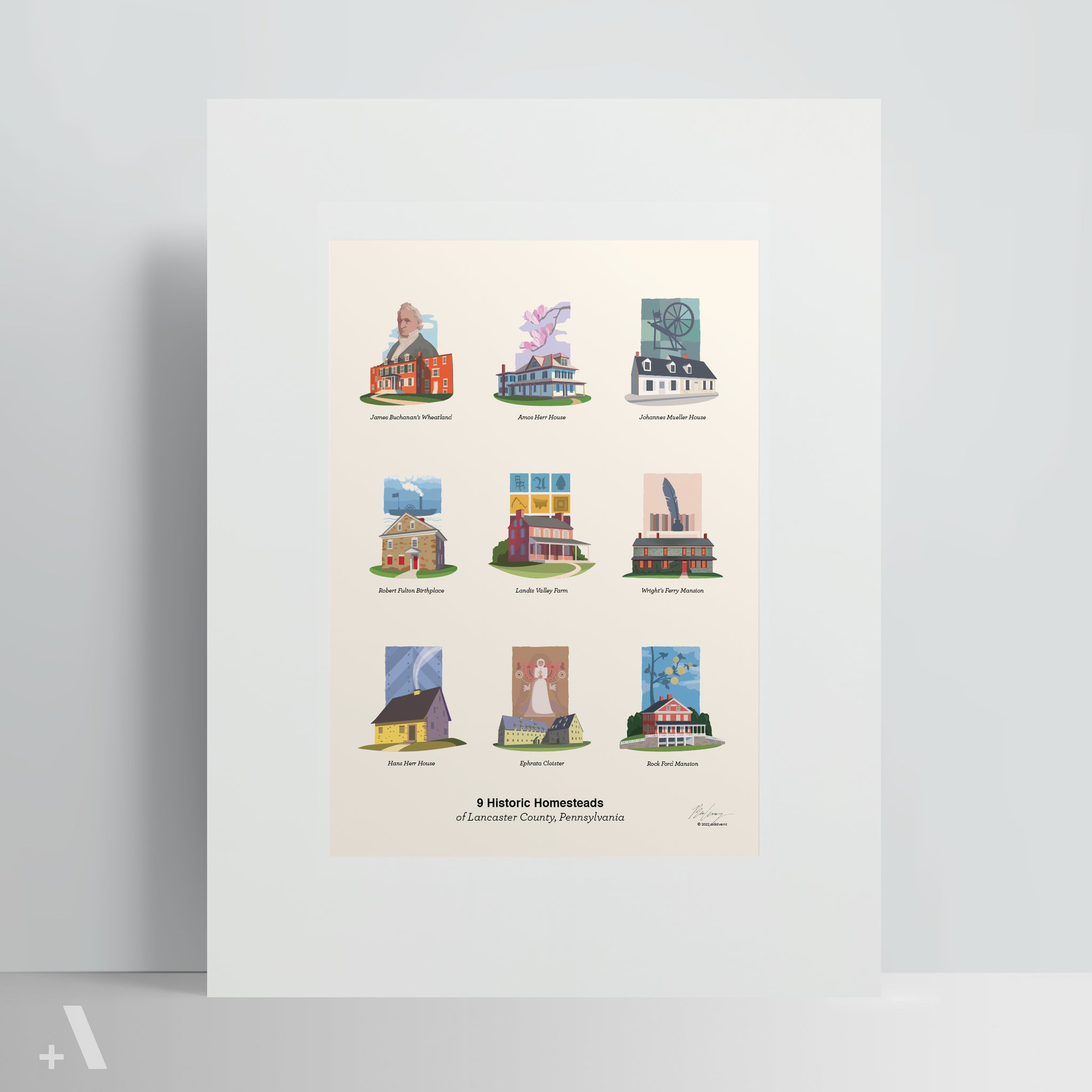 - Digitally Illustrated Design – Featuring 9 historic Lancaster County homesteads