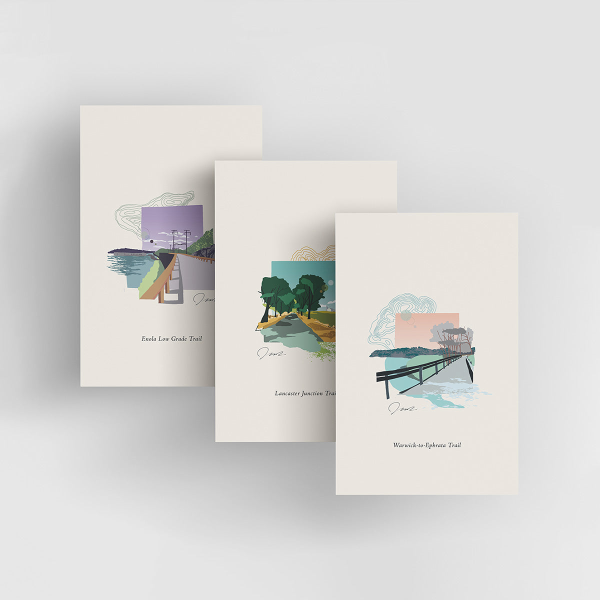 - Digitally Illustrated Designs – Featuring six Lancaster County rail trails in detailed, rustic style
